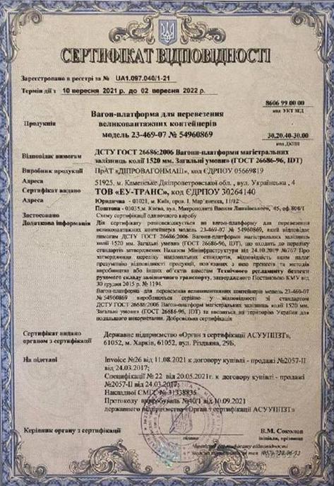 20 серпня 2021На виконання Постанови Кабінету Міністрів № 1194 та Наказу МІУ №767 ТОВ ЕУ Транс виконано сертифікацію власного рухомого складу що до відповідності Технічному Регламенту з безпеки.