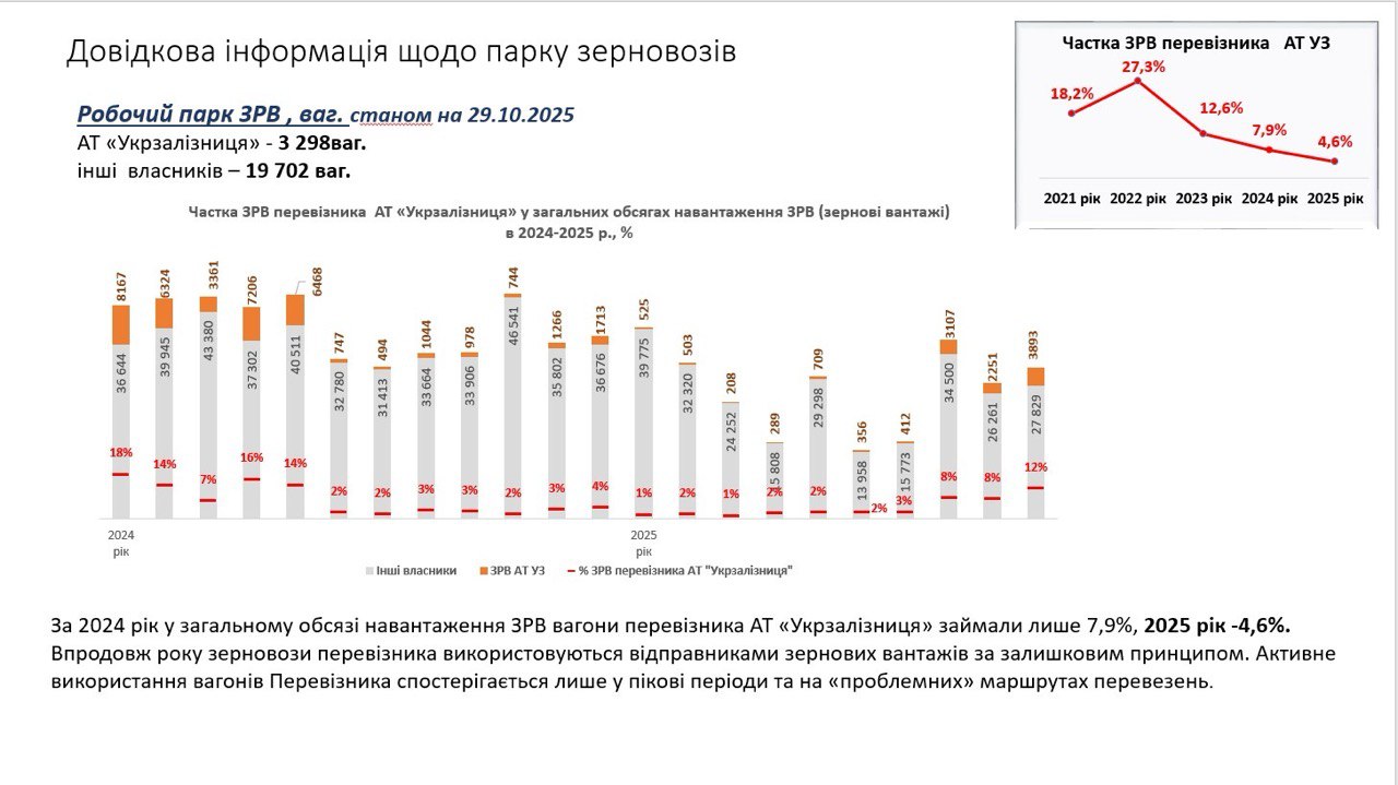 - за 2025 рік перевезено 28,86 млн. тон зерна, що на 27% (10,85 млн. тон) менше ніж у 2024 році. З них на експорт перевезено 25,48 млн. тон: 8% - на західні переходи і 92% - на порти.